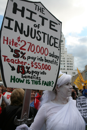 One of the shameful things that both groups do is attempt to co-opt language in order to mask their agendas. First up is the group called the Commonwealth Foundation which is a name that has little to do with the common good. This is the group that refers to the PFT as ‘pathetic for teachers’ and actually hired some fools to hand out anti- union literature at yesterday’s rally. The funding for this group is clouded in obscurity – you can’t find that information on their website. The second group is the Philadelphia School Partnership – again taking a word (partnership) that implies a common good but when you examine their website you find that at least 65% of their funding goes to charter and private schools and when you look for their funding partners you again find a lack of information. When this group has spoken at SRC meetings it is unfailingly to support the charter school movement. If they have supported fair funding for public schools in Harrisburg they do not put that on their website.
